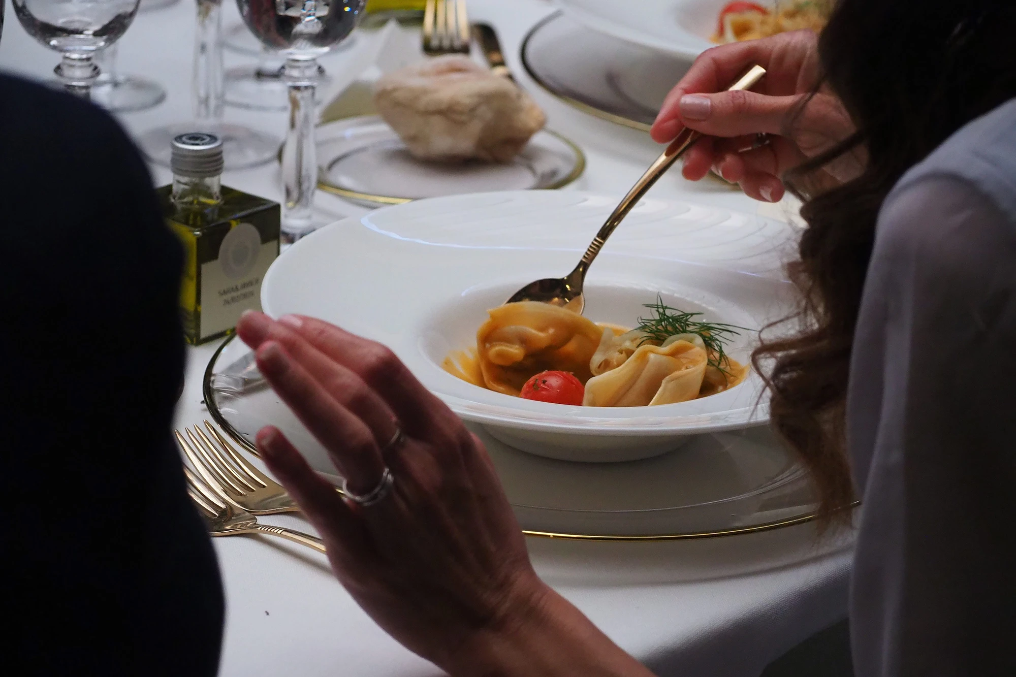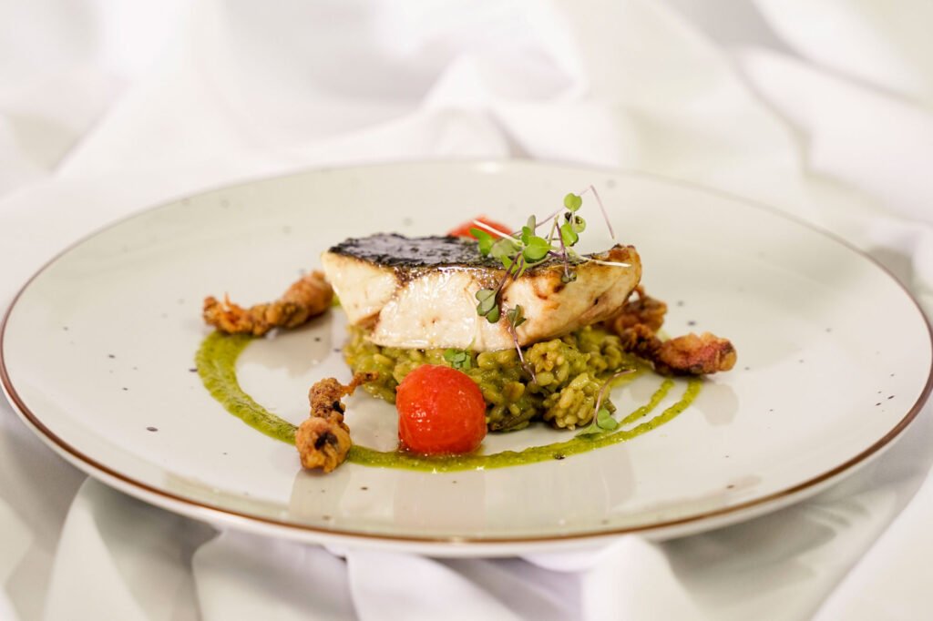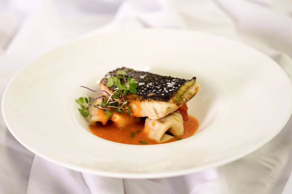 Corvina asada, raviolis de calabaza y sopa provenzal