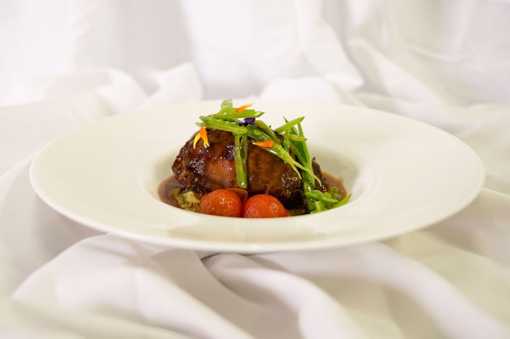 Carrillera melosa de ternera, puré trufado de patata y juliana de tirabeques