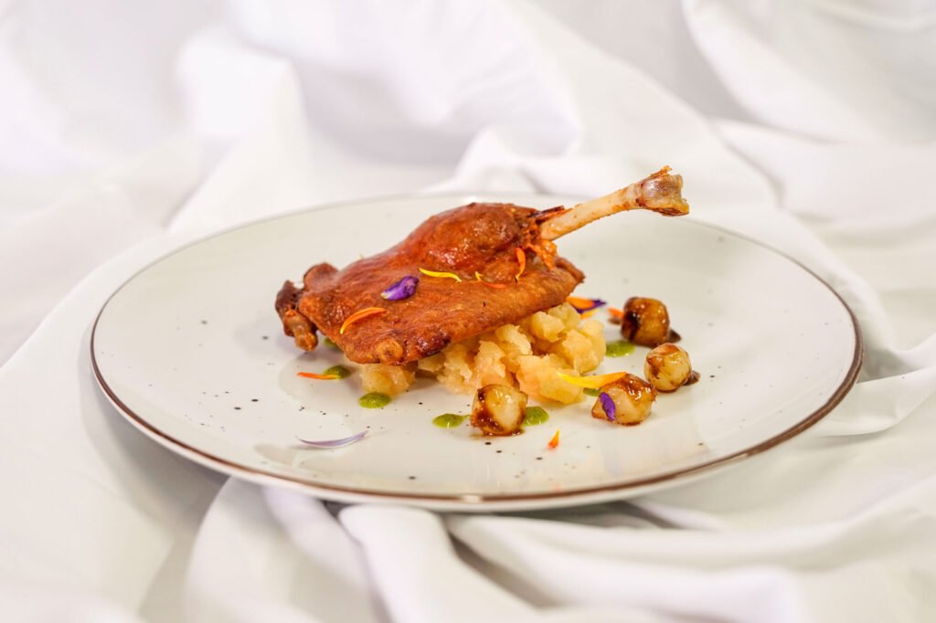 Confit de pato, manzana asada y cebollitas glaseadas con hosin