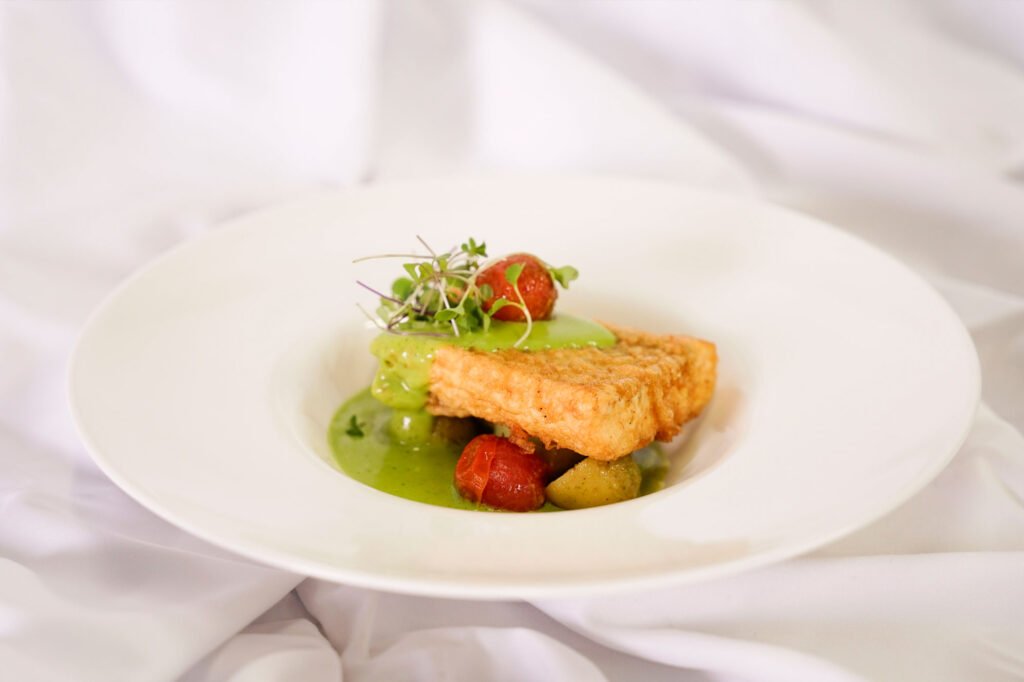 Merluza rebozada, crema de guisantes con hierbabuena y patatas baby