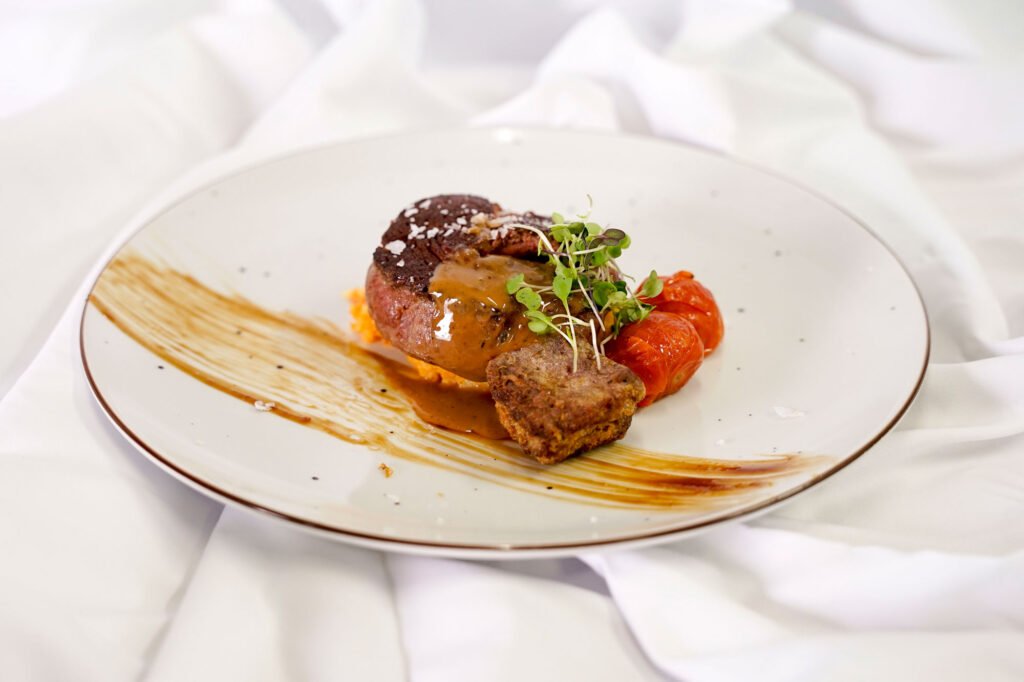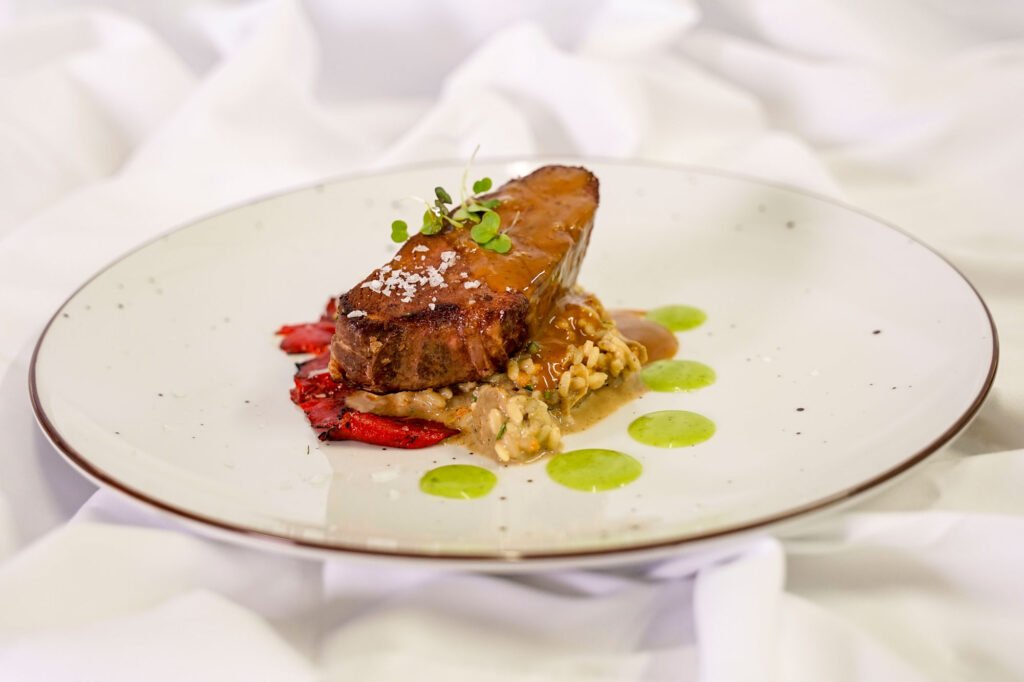 Solomillo de vaca a la parrilla, trinxat de patata y panceta, torrija de vino tinto y salsa de foie