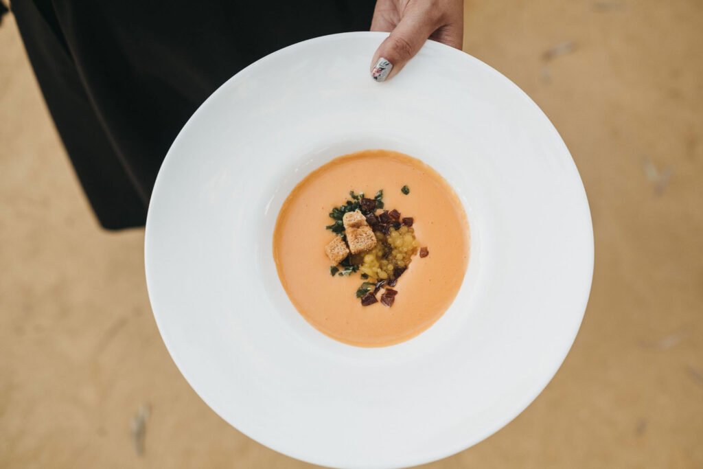 Salmorejo, virutas de jamón y perlas de aceite de oliva virgen