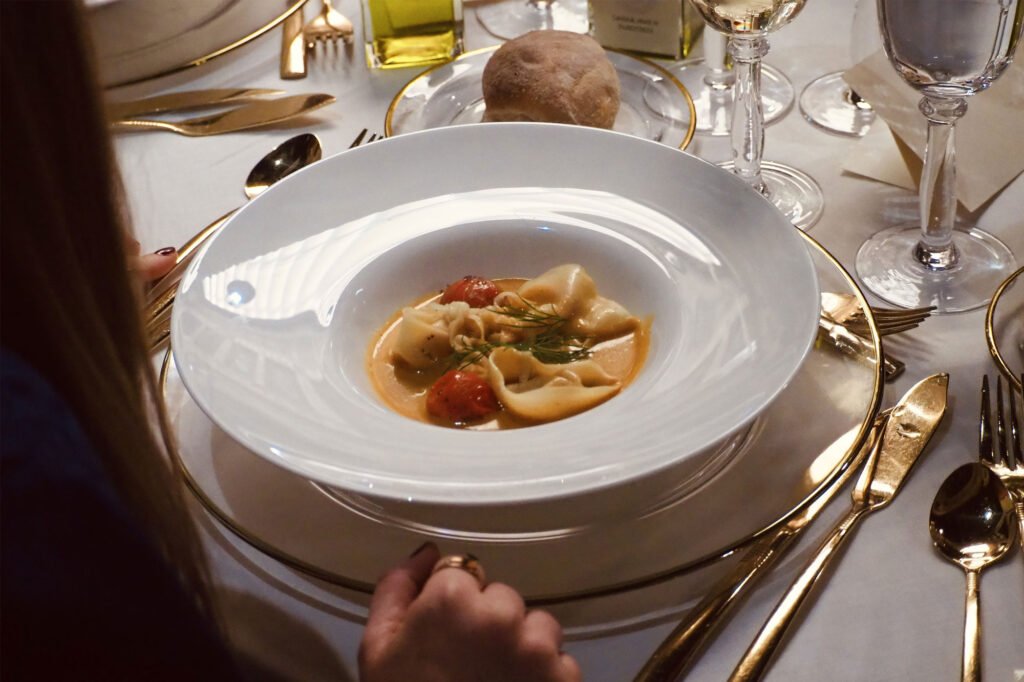 Tallarines de choco de Huelva, raviolis de tomate y crema de mariscos